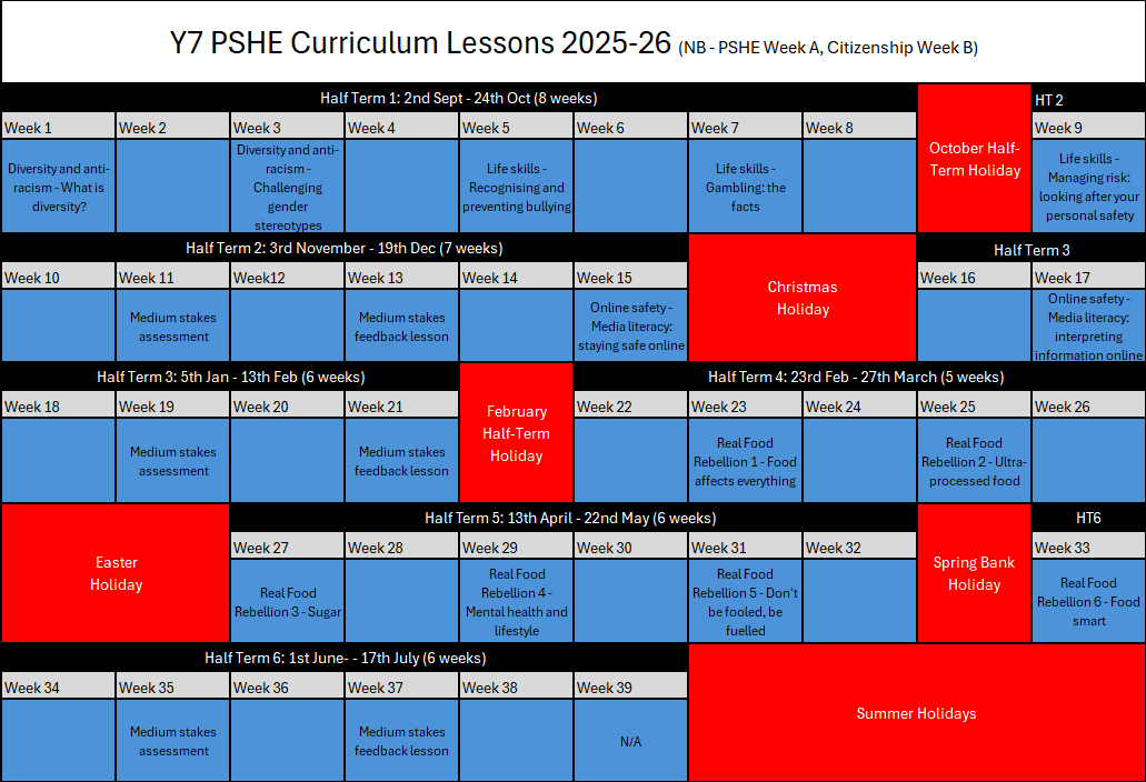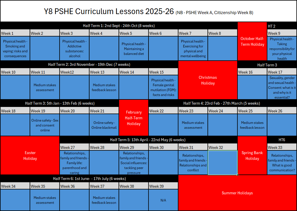 The PSHE curriculum is designed to support students’ personal development, wellbeing, and preparation for adult life. It provides guidance on key areas such as health, relationships, safety, and essential life skills, helping students to become informed, responsible, and resilient individuals. Overarching topic areas include: