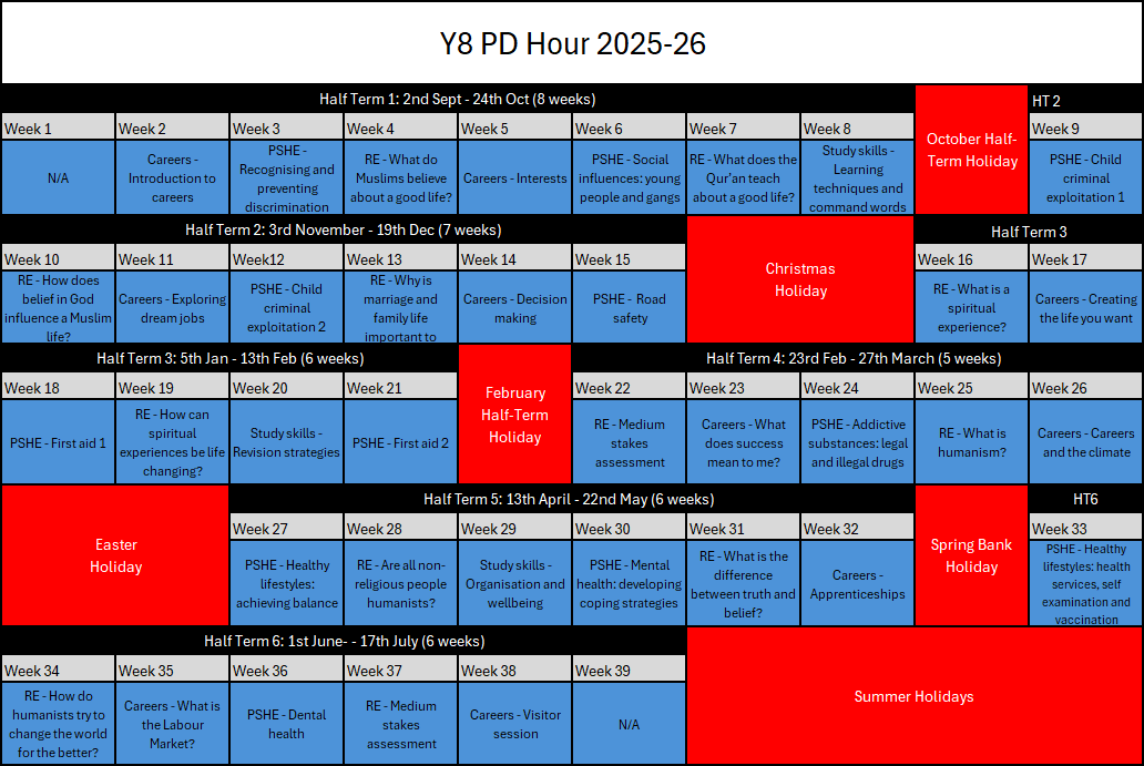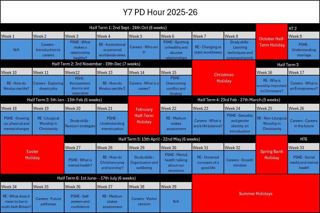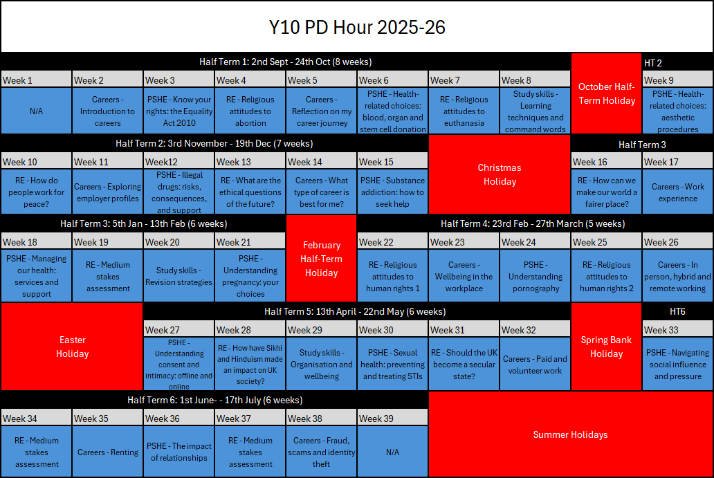 - Year 9 to 11: PSHE lessons are delivered solely through PD hour to prioritise GCSE subjects in their regular timetables.