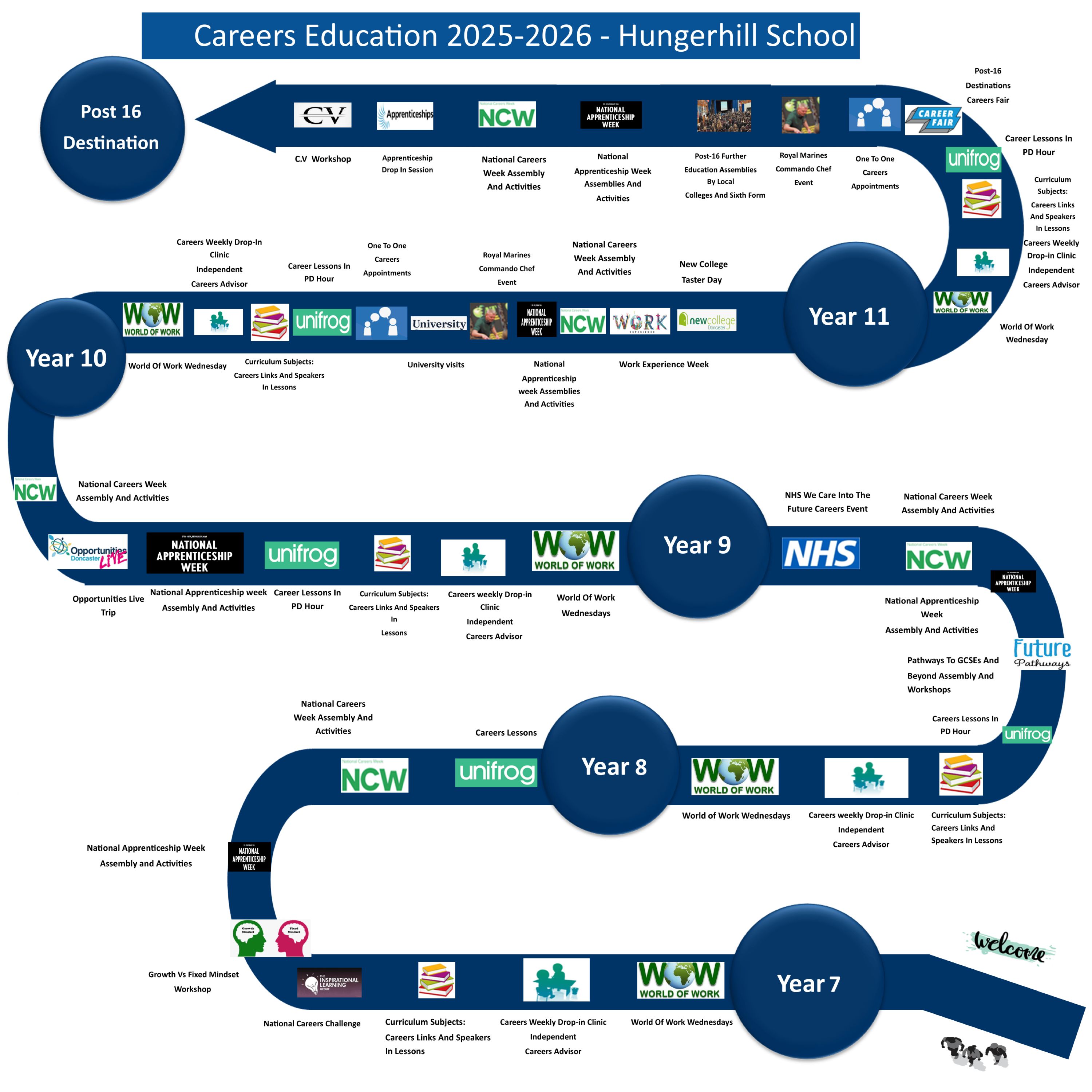 At Hungerhill, our careers education and guidance programme is designed to build skills in our students for lifelong success in a diverse and ever-changing world of further education and work. Together with a range of career professionals, businesses and training providers we will support students’ career development in a number of ways including: